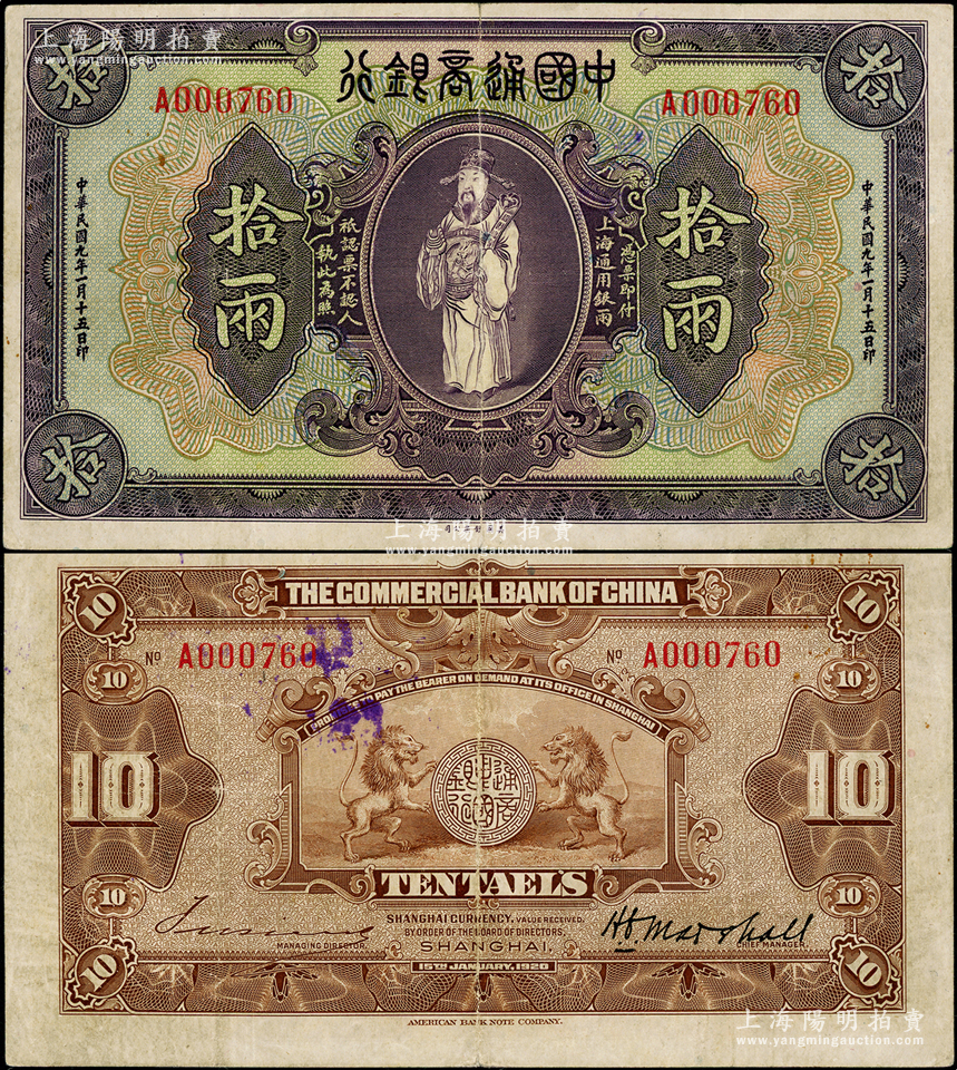 民国九年(1920年)中国通商银行紫色财神图拾两,上海地名,原票八成新