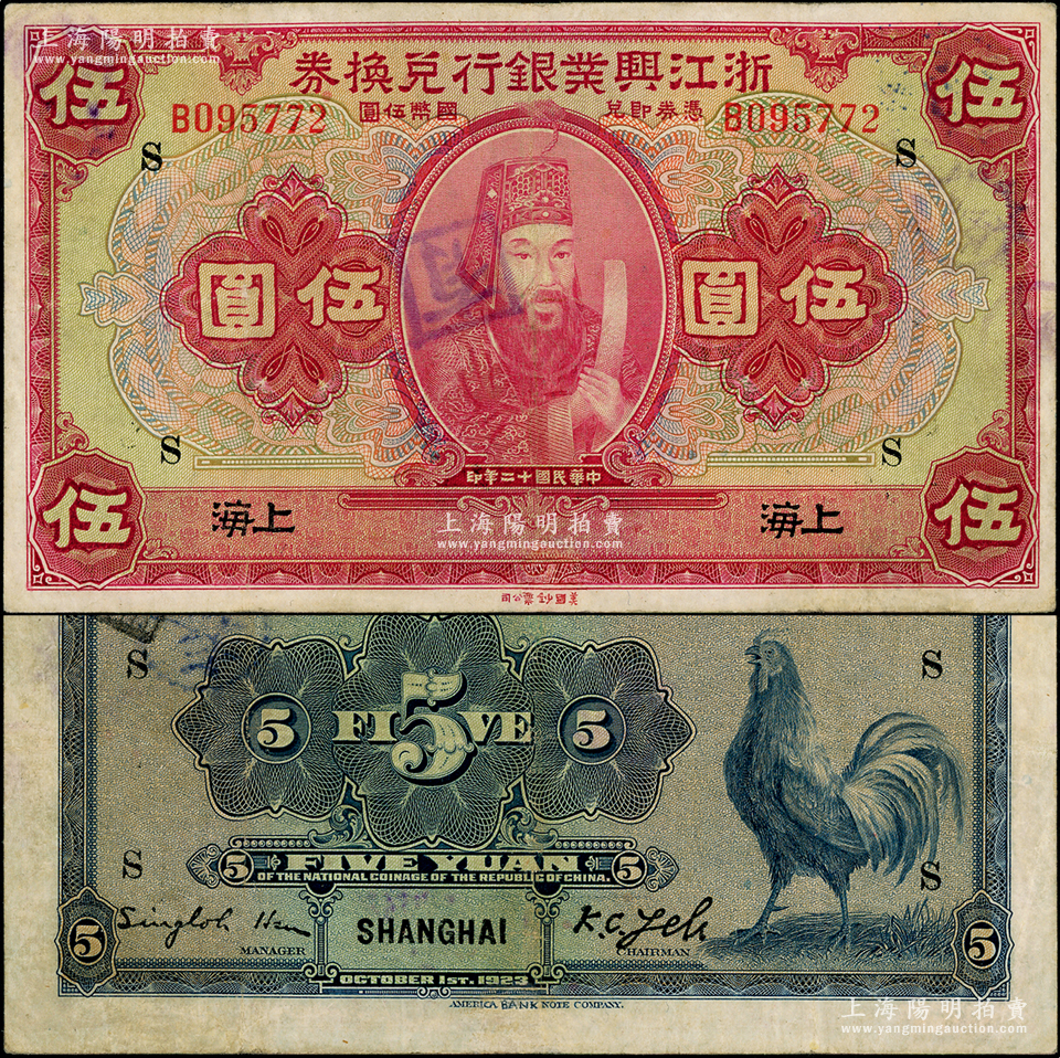 民国十二年(1923年)浙江兴业银行兑换券伍圆,上海地名,上印浙东先贤王阳明先生像,加印领券“S”字;资深藏家出品,八成新