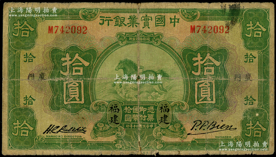 民国二十年(1931年)中国实业银行拾圆,福建·厦门地名,属第一版签名券;江南藏家出品,少见,边有老式小贴痕,七成新