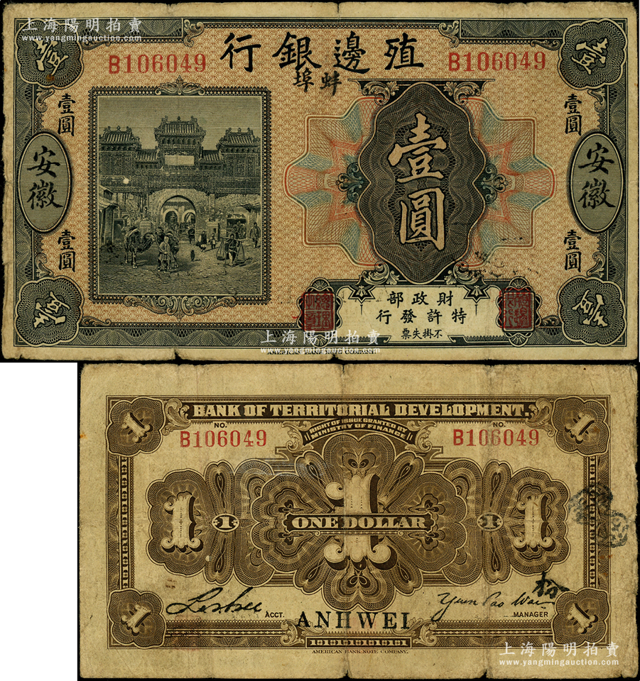 殖边银行无年份美钞版壹圆,安徽·蚌埠地名,背面签名旁盖有“枌”字,堪称该行纸币之翘楚;资深藏家出品,罕见,原票七成新