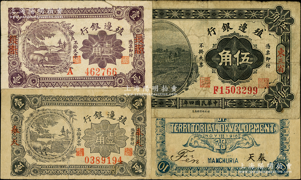 殖边银行纸币3种,详分:1915年东三省伍角,1916年长春壹角、奉天壹角;海外藏家出品,原票七成新