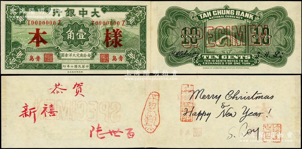 民国十年(1921年)大中银行长城图壹角样本券,青岛地名,正背共2枚,其中背面钤有1960年代著名集钞家柏文先生印章及“恭贺新禧”、英文题字等,颇具集钞历史之记忆;海外藏家出品,九五成新