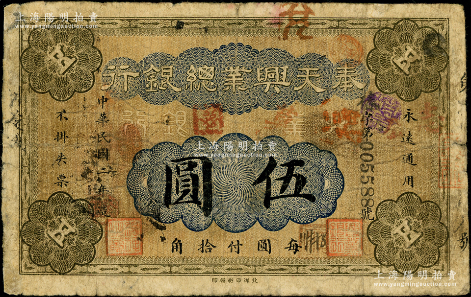 民国二年(1913年)奉天兴业总银行伍圆,诚属东北纸币之珍罕品种,边侧有小修,七成新,值得珍视和推重