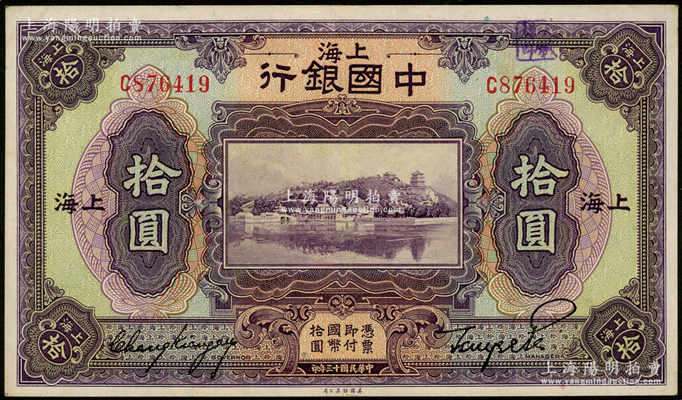 民国十三年(1924年)中国银行拾圆,上海地名,张嘉璈·贝祖诒签名;源于前辈名家之遗藏,已属所见之较佳品相,八五成新