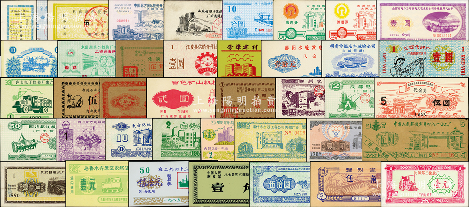 1958年至1990年代末新中国各地企业、银行、部队、监狱等发行之各种代金券、厂币藏品集一册共470余种不同,内中涉及20多个不同省份(包括新疆、内蒙),涵盖面极其广泛,因数量繁多、风格各异,难以逐一细述;时因改革开放初期,国内货币流量不足,故各地国有企业及部队等自80年代起发行各种代金券以敷本地使用,是项钞券可视为清末民国之民间钞票在新中国之延续;源于藏家出品,能收集如此丰富