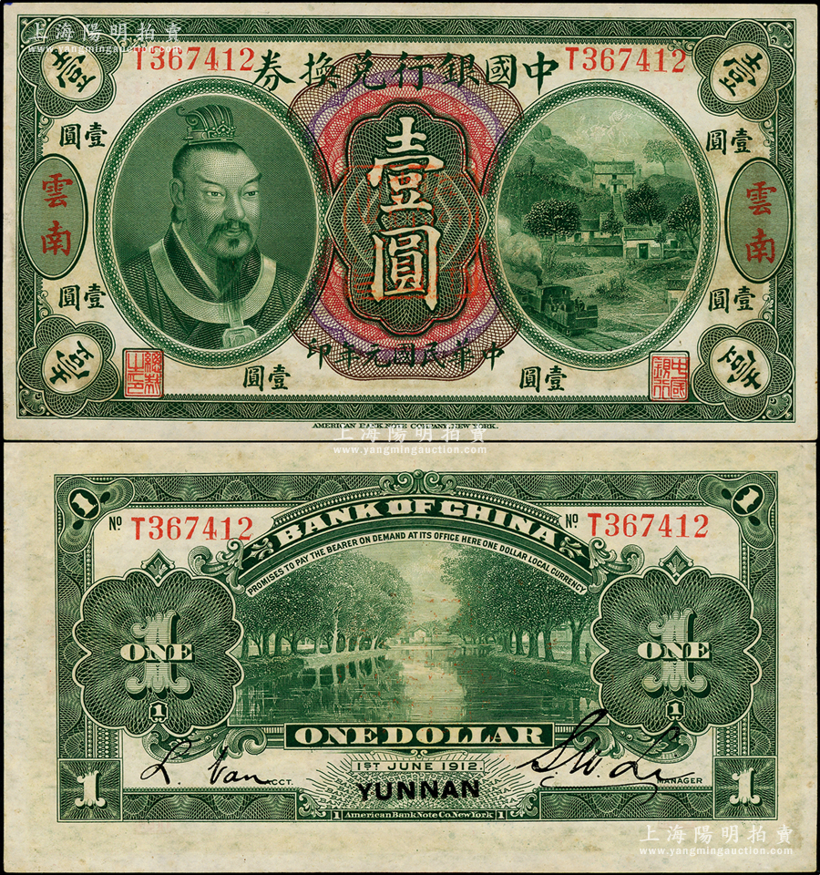 民国元年(1912年)中国银行兑换券黄帝像壹圆,云南地名,李士伟·范磊签名,上佳品相,九五成新