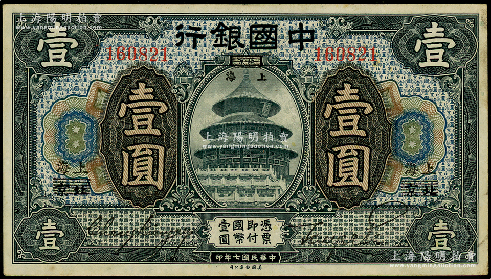 民国七年(1918年)中国银行黑色壹圆,北京改上海地名,张嘉璈·贝祖诒签名,已属较佳品相,原票八成新