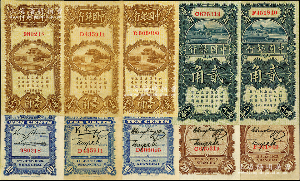 民国十四年(1925年)中国银行竖式上海壹角3种、贰角2枚,合计共有5枚,其中壹角券分别为金还(无字轨)、冯耿光、张嘉璈签名,贰角券均为张嘉璈·贝祖诒签名,八五至九五成新