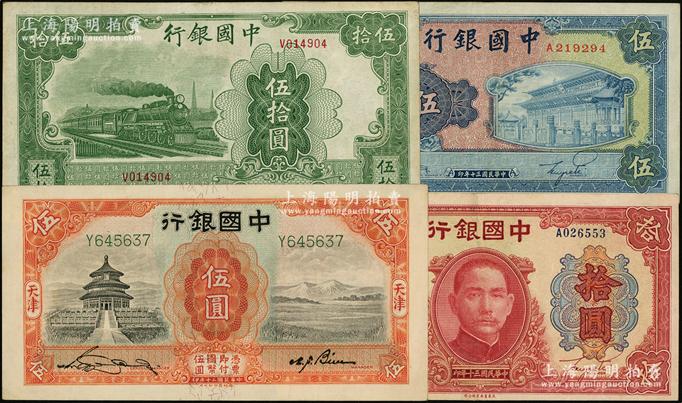 中国银行纸币4种,详分:1931年天津伍圆,1941年商务版伍圆、大东版拾圆,1942年大东版伍拾圆,均属单字轨;源于前辈名家之遗藏,八至九成新