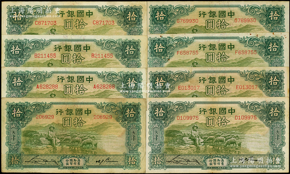 民国二十三年(1934年)中国银行牧羊图拾圆共8枚,内含无字轨和A、B、C、D、E、F、G单字轨,天津地名,宋汉章·卞寿孙签名,七至八成新