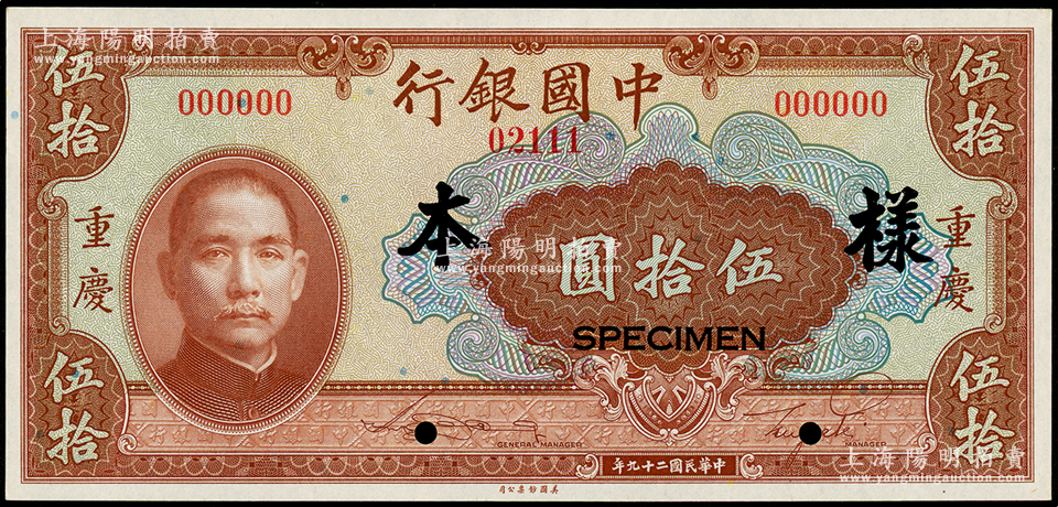 民国二十九年(1940年)中国银行美钞版伍拾圆仅正面样本券,重庆地名;资深藏家出品,九八成新