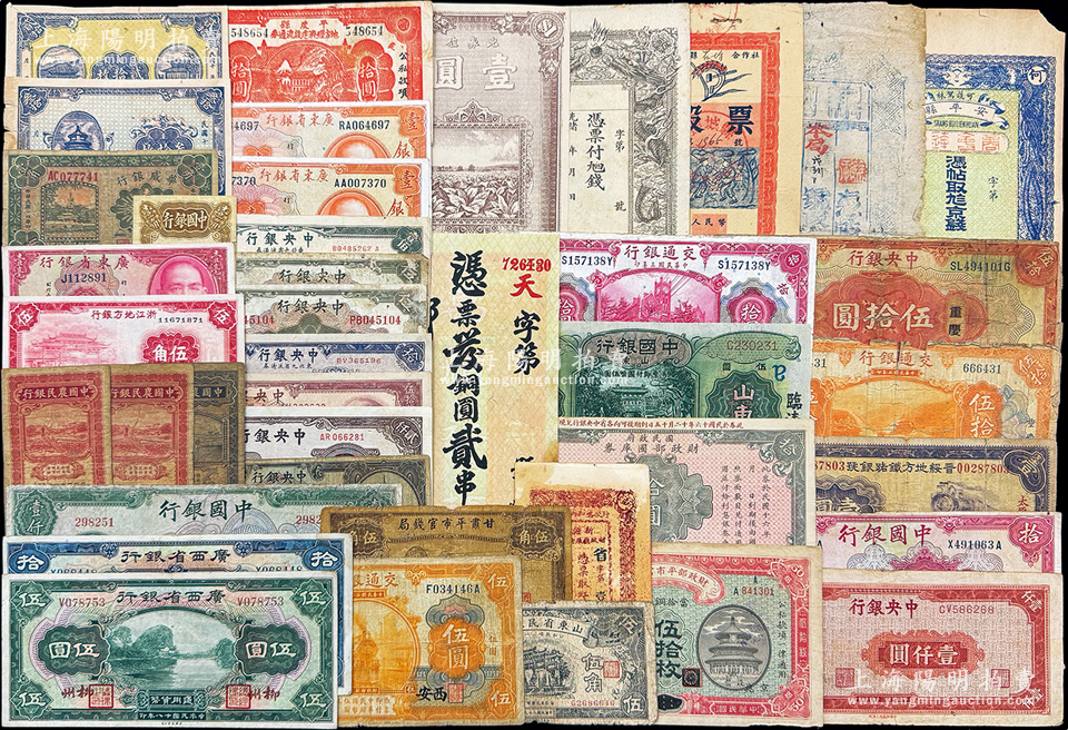纸币等一组共46枚,内含国家银行、省银行、清代至民国钱庄票、外钞等,其重点有:中国银行1942年壹仟圆,交通银行1914年西安伍圆,广西省银行1929年柳州伍圆、梧州拾圆等,因品种丰富,难以细述,其中1枚为假钞、2枚为后加盖,破损品至九成新,返品不可,敬请预览和审视