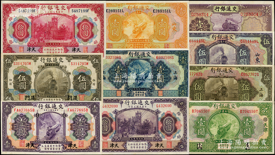交通银行纸币10种,详分:1914年天津壹圆、厦门伍圆、天津红色拾圆、紫色拾圆,1927年蓝色上海壹圆、桔色山东壹圆、绿色天津壹圆、上海伍圆、山东伍圆,1935年壹圆,八至九五成新,敬请预览