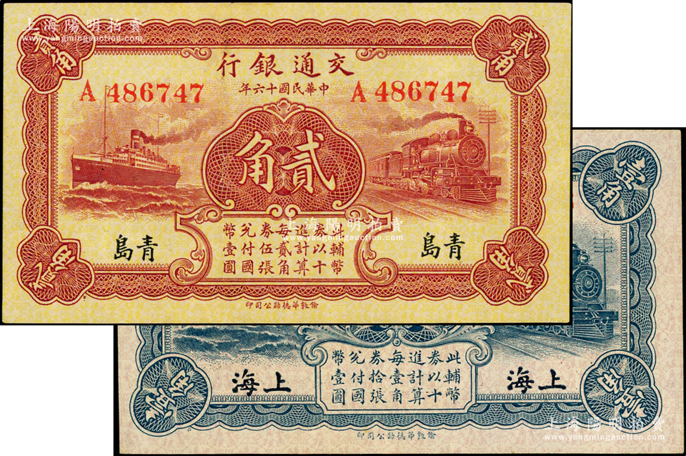 民国十六年(1927年)交通银行蓝色壹角、棕红色贰角共2枚不同,其中:壹角券为上海地名,无字轨,第一版梁士诒·李锺楚签名;贰角券为青岛地名,单字轨,第二版卢学溥·李锺楚签名;九至九五成新