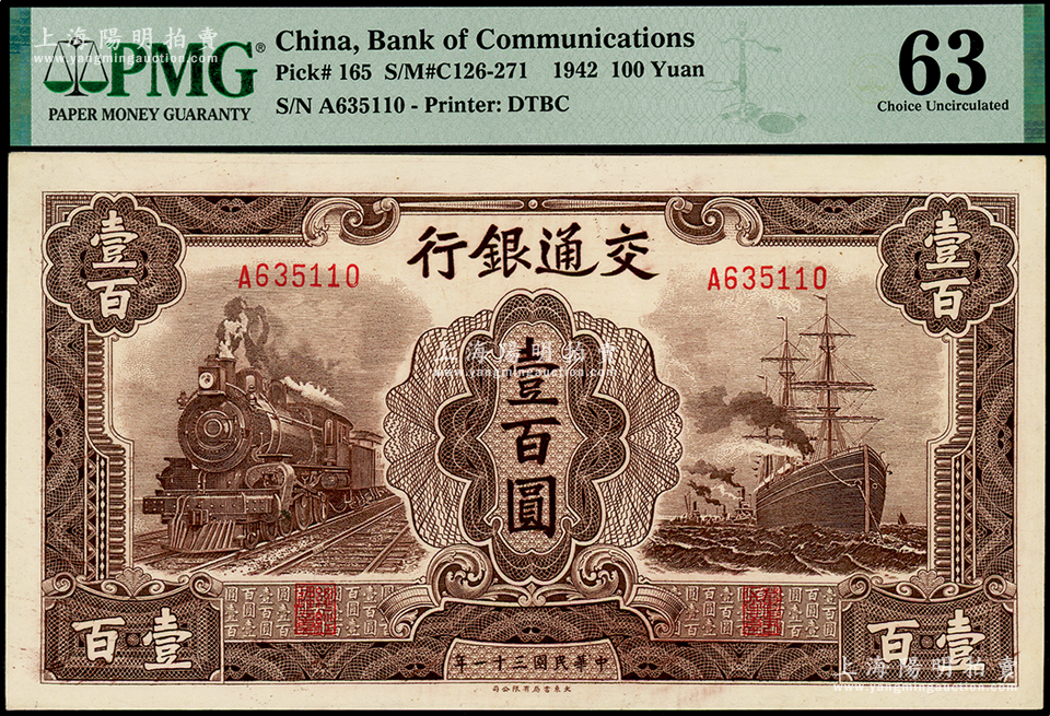 民国三十一年(1942年)交通银行大东版壹百圆,单字轨,上佳品相,九八成新