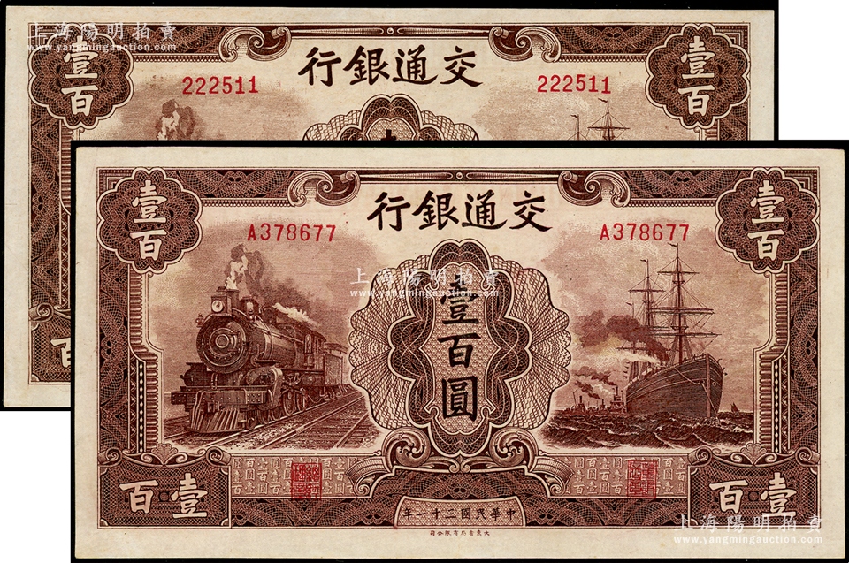 民国三十一年(1942年)交通银行大东版壹百圆共2枚,分别为无字轨和单字轨,号码颇佳,九成新