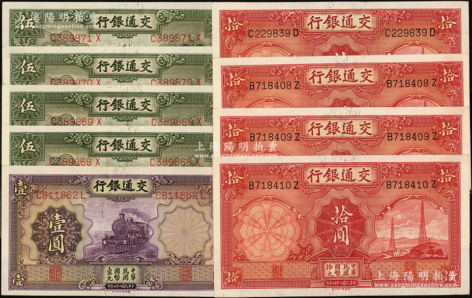 民国二十四年(1935年)交通银行德纳罗版纸币9枚,内含壹圆、伍圆4枚连号、拾圆4枚(其中3枚连号);源于前辈名家之遗藏,九五至九八成新