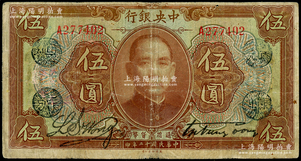 民国十二年(1923年)中央银行棕色伍圆,单字轨,加盖“广州总行”蓝戳,宋子文·黄隆生签名,七成新
