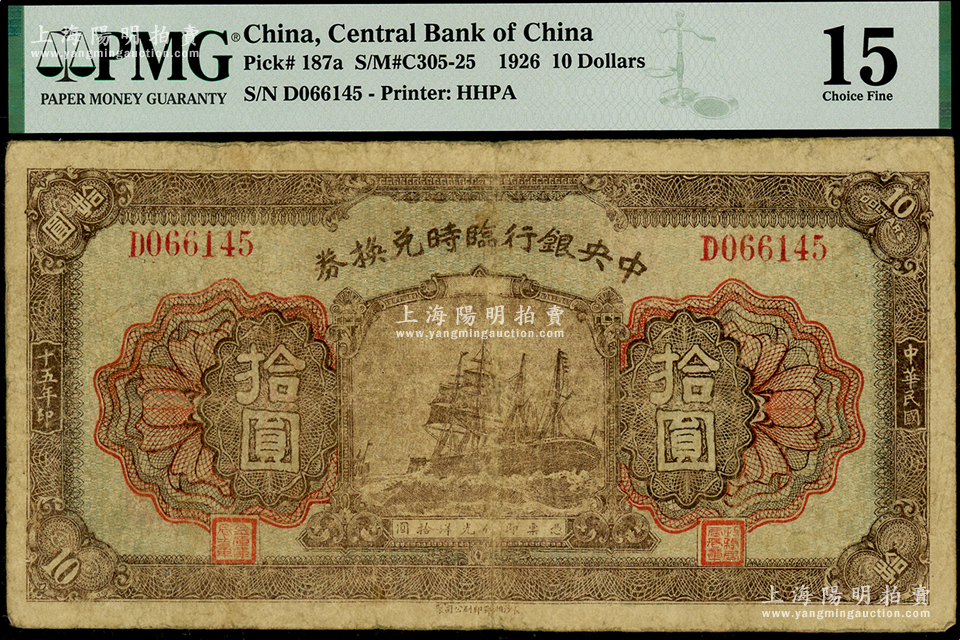 民国十五年(1926年)中央银行临时兑换券拾圆,背印国民革命军总司令部蒋中正之告示;海外藏家出品,原票七成新