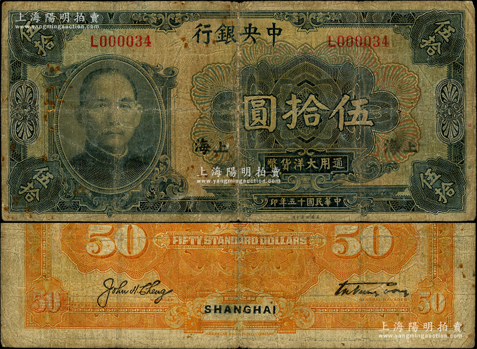 民国十五年(1926年)中央银行大洋伍拾圆,上海地名,其号码仅为L000034号;此券原属汉口地名券,发行于“宁汉分裂”之时,后因停兑而冒充改为上海地名券;资深藏家出品,罕见,原票七成新