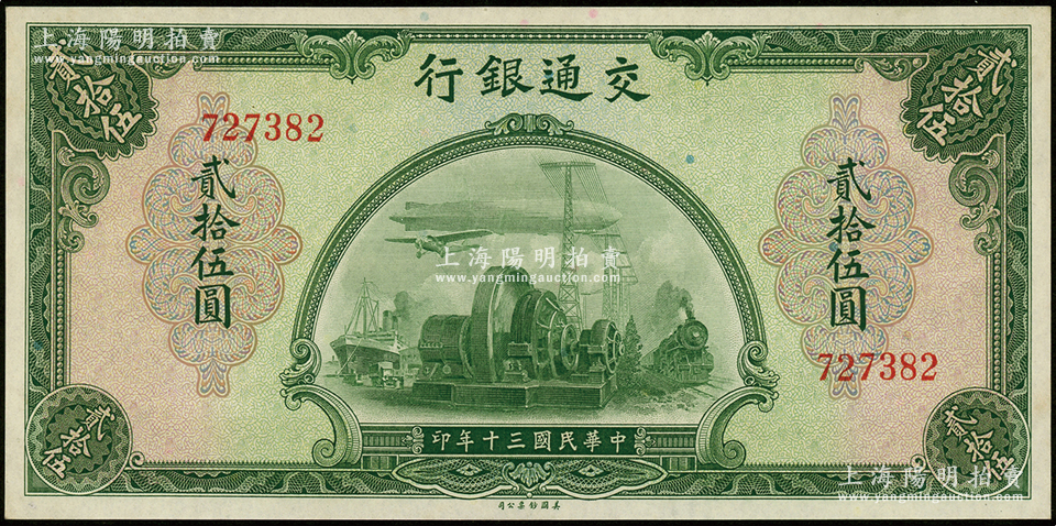 民国三十年(1941年)交通银行美钞版贰拾伍圆,无字轨,源于前辈名家之遗藏,原汁原味,九八成新