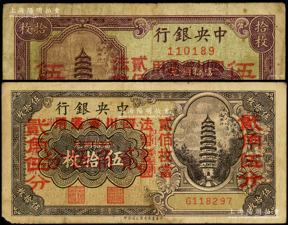 中央银行“四川省通用”辅币券2种,详分:拾枚改伍分,无字轨;伍拾枚改贰角伍分,单字轨,属第一版双改券,其大红字下又有“四川省通用·贰百枚当法币壹圆”小红字;原票七成新