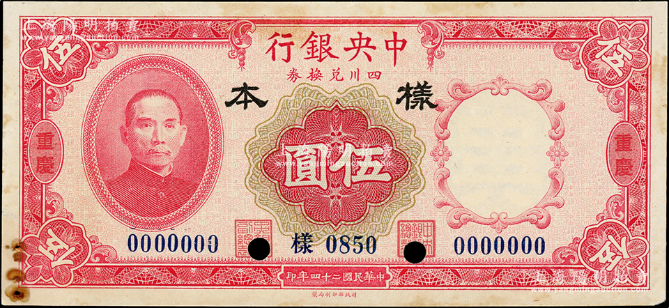民国廿四年(1935年)中央银行四川兑换券伍圆样本,正背共2枚,重庆地名;源于森本勇先生之旧藏,少见,上有档案针孔小锈斑,未折八五成新
