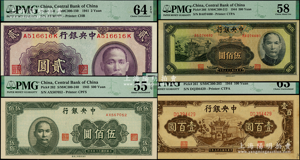 中央银行法币4种,详分:中华版1941年贰圆,信托版1944年棕牌坊壹百圆(错版券·号码职章印刷向下移位)、伍佰圆,上海厂1945年伍佰圆;海外藏家出品,九五至全新