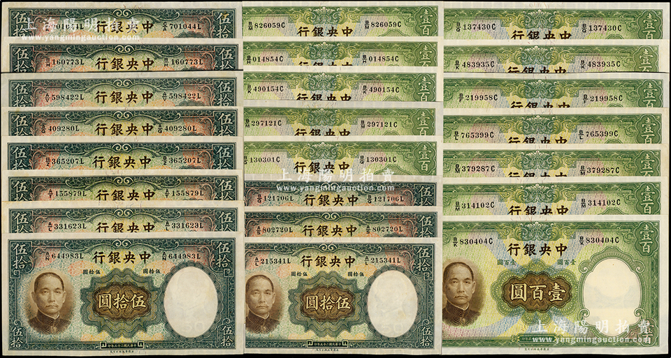 民国二十五年(1936年)中央银行华德路版伍拾圆11枚、壹百圆12枚,合计共有23枚,九至九五成新