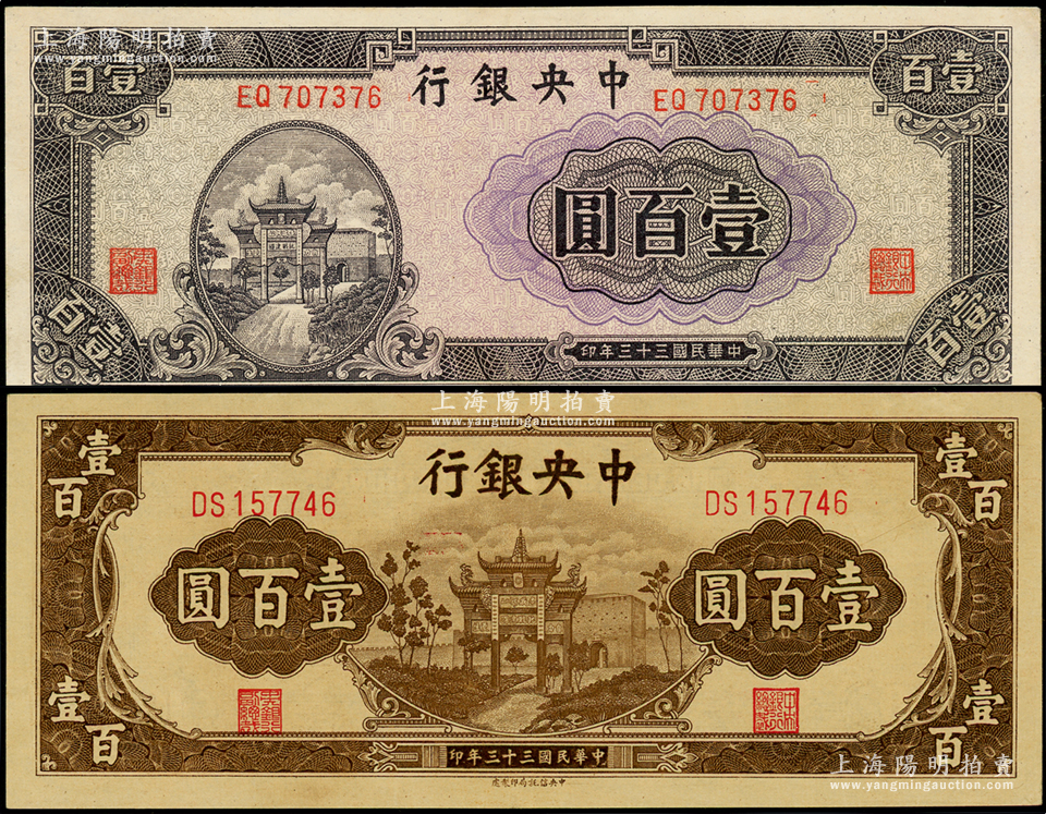 民国三十三年(1944年)中央银行信托版紫色牌坊图壹百圆、棕色牌坊图壹百圆共2枚不同,九五至九八成新