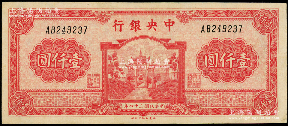 民国三十四年(1945年)中央银行福建百城版壹仟圆,九成新