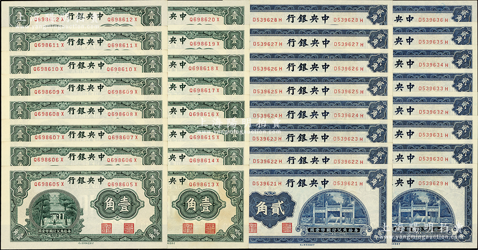 中央银行中华版杏坛壹角、洙水桥贰角各16枚连号,合计共有32枚;源于前辈名家之遗藏,全新