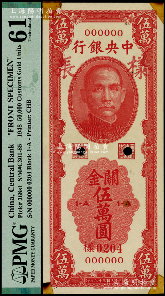 民国三十七年(1948年)中央银行关金中华版红色伍万圆样张,仅有正面,少见,PMG 61 UNC