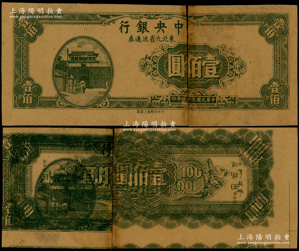 民国三十四年(1945年)中央银行东北九省流通券壹佰圆,属无职章、号码之牛皮纸试印票,且背面花纹与正面图案重叠黏印,少见,唯惜中间已断开,敬请预览