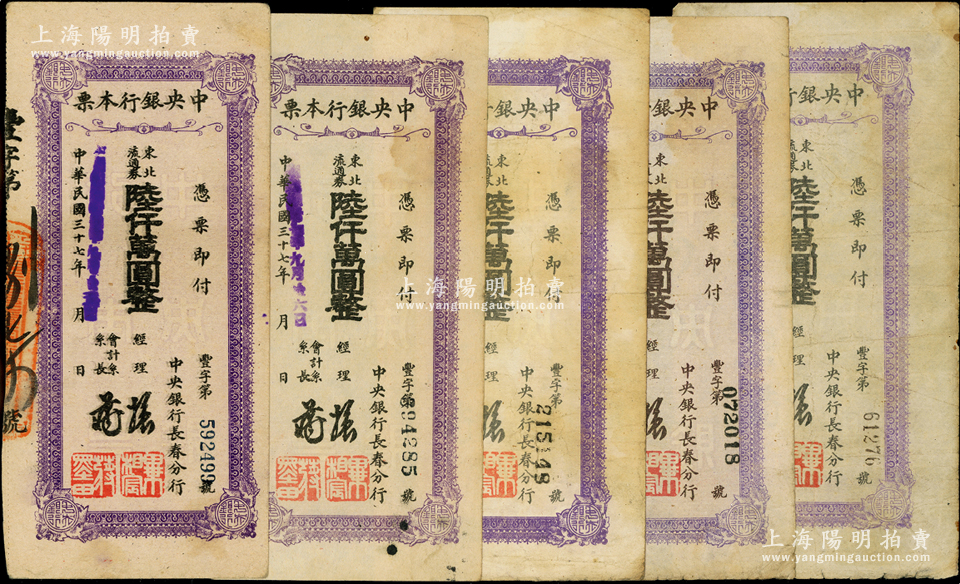 民国三十七年(1948年)中央银行长春分行本票东北流通券陆仟万圆共5枚,内含厚纸版和薄纸版、5位号和6位号券之分,七至八成新