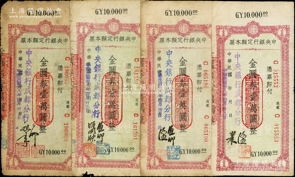 民国卅八年(1949年)中央银行(成都分行)定额本票金圆券壹万圆全套共4种不同签名,七至七五成新