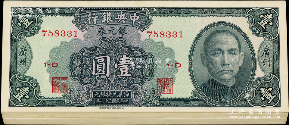 民国三十八年(1949年)中央银行银元券壹圆共40枚,分两组连号,广州地名,九八成新