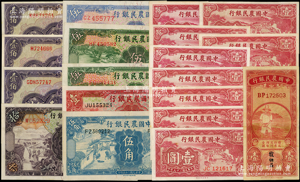 中国农民银行纸币19枚,详分:无年份版红色农夫图壹角,1935年德纳罗版壹圆、伍圆2枚、拾圆,1936年德纳罗版伍角,1940年大业版壹圆9枚,1941年德纳罗版伍圆、美钞版壹佰圆2枚、重庆壹佰圆,八至九五成新