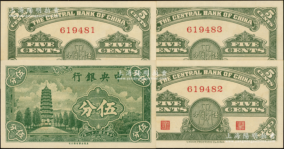 民国二十八年(1939年)中央银行美商永宁版伍分“无字轨”共3枚连号,源于前辈名家之遗藏,少见,全新