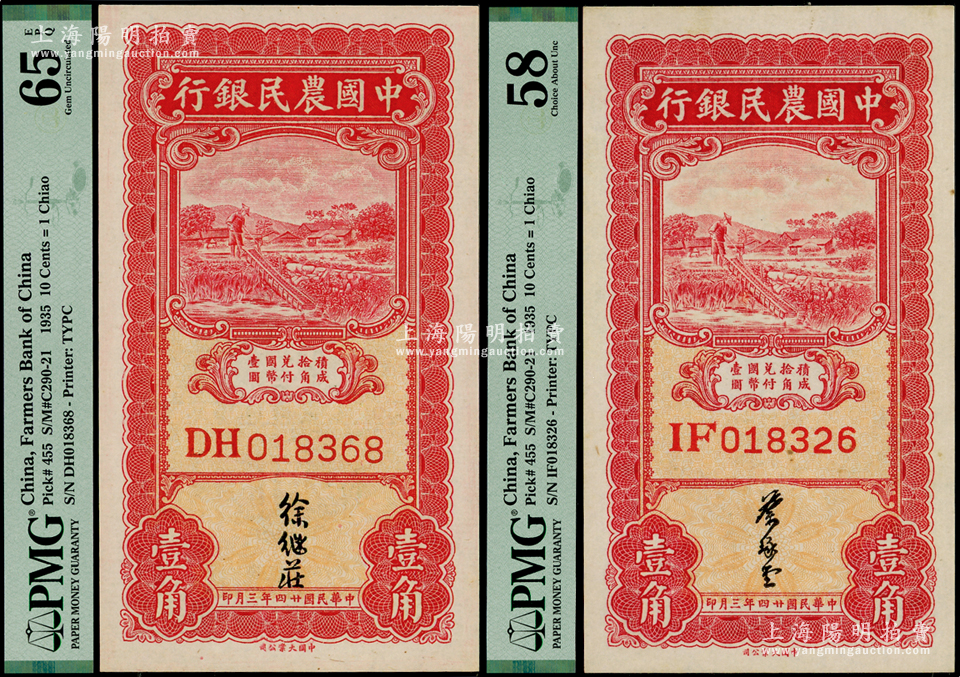 民国廿四年三月(1935年)中国农民银行壹角共2枚不同,双字轨,分别为徐继庄、叶琢堂签名;海外藏家出品,九八至全新
