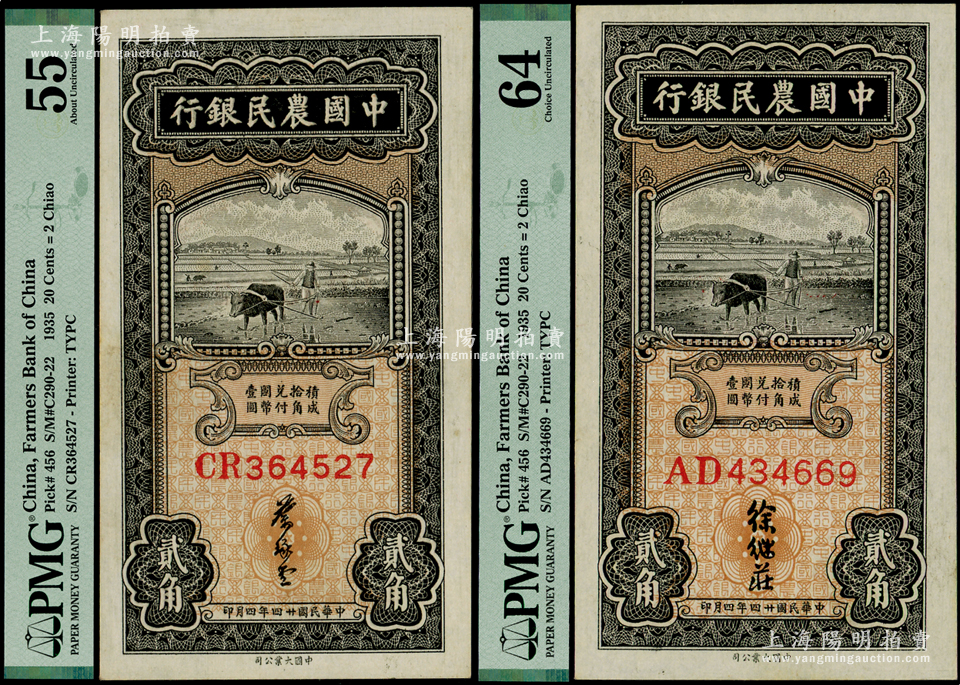民国廿四年(1935年)中国农民银行大业版黑色牛耕田图贰角共2枚不同,双字轨,分别为徐继庄、叶琢堂签名;海外藏家出品,九五至全新