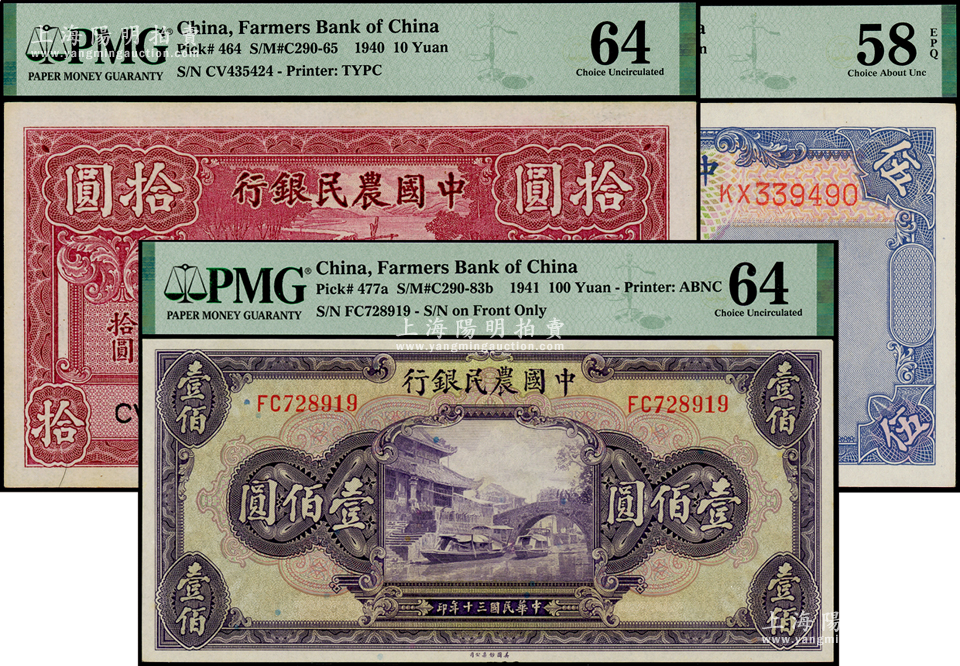 中国农民银行纸币3种,详分:1940年大业版拾圆,1941年德纳罗版伍圆、美钞版壹佰圆,PMG 64 and 58 EPQ