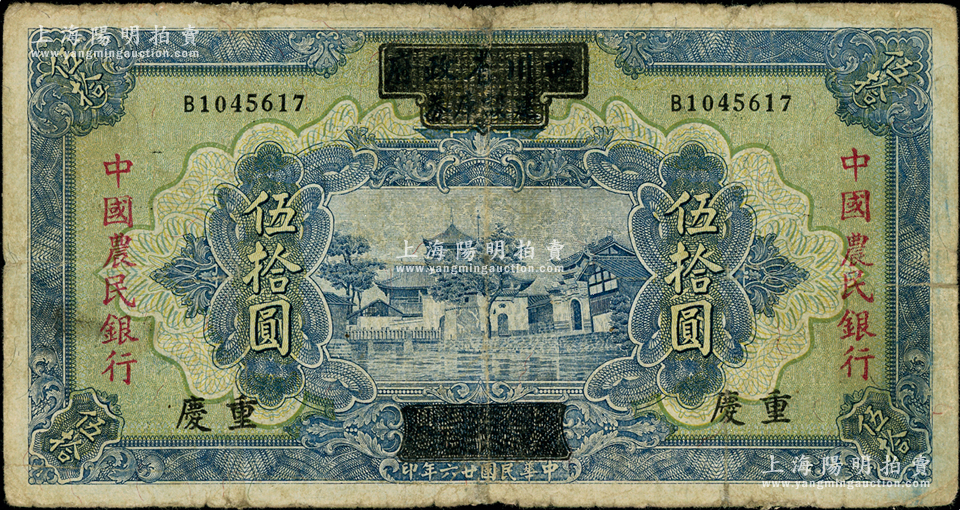 民国廿六年(1937年)四川省政府建设库券改中国农民银行伍拾圆,重庆地名;源于上海前辈藏家顾文炳先生之旧藏,背盖“文炳珍藏”收藏章,边有修补,七成新