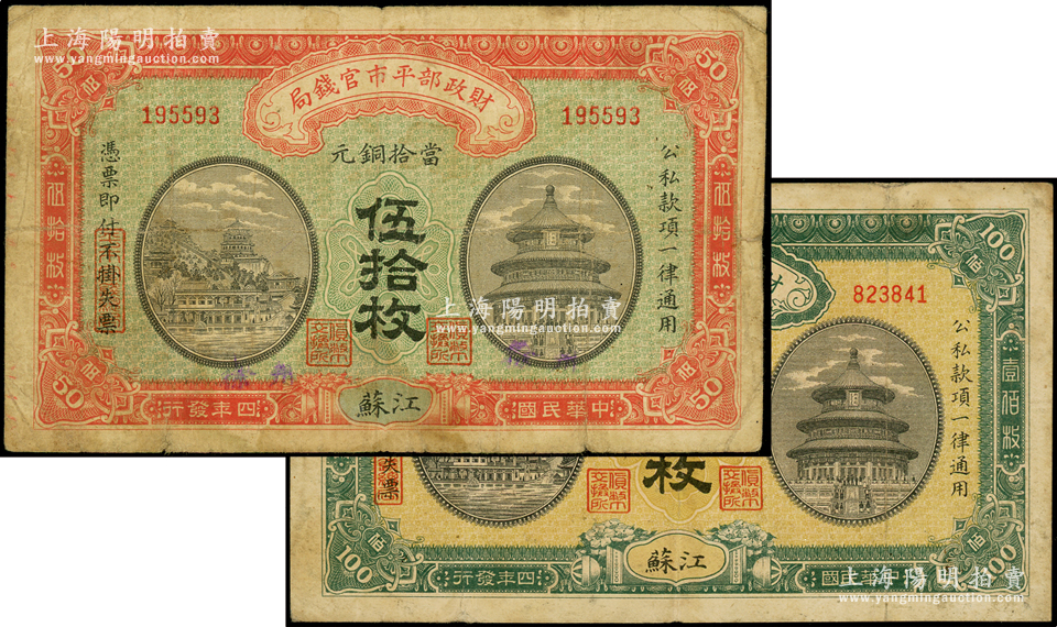 民国四年(1915年)财政部平市官钱局当拾铜元伍拾枚、壹佰枚共2枚不同,均为江苏地名,其中伍拾枚票上又手盖“徐州”地名;海外藏家出品,原票七至七五成新