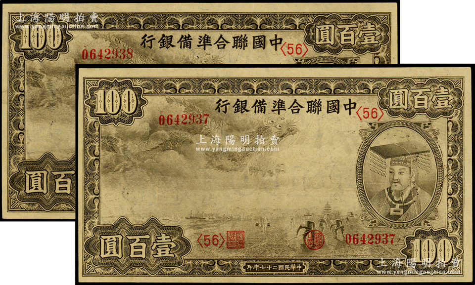 民国二十七年(1938年)中国联合准备银行小龙壹百圆共2枚连号,均属浅色版<56>号券,九八成新