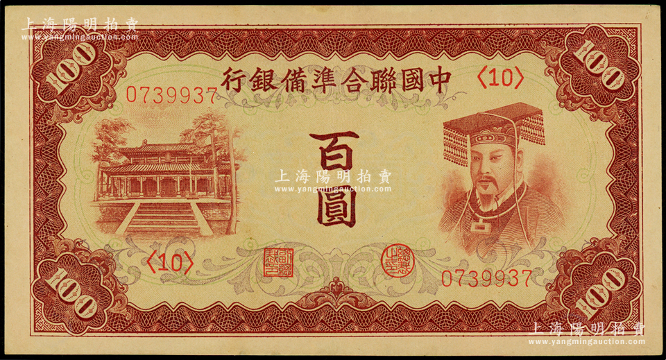 中国联合准备银行(1941年)棕色左大殿右帝百圆,品相甚佳,九五成新