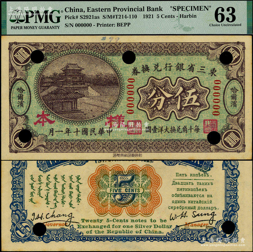 民国十年(1921年)东三省银行兑换券伍分样本,正背面合印,哈尔滨地名,属第一版“征蒙”专用,故背印蒙文和俄文,且有英文签名,少见,九五成新