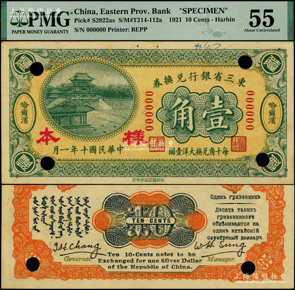 民国十年(1921年)东三省银行兑换券壹角样本,正背面合印,哈尔滨地名,属第一版“征蒙”专用,故背印蒙文和俄文,且有英文签名;此钞属6位号第一版样本,少见,九五成新