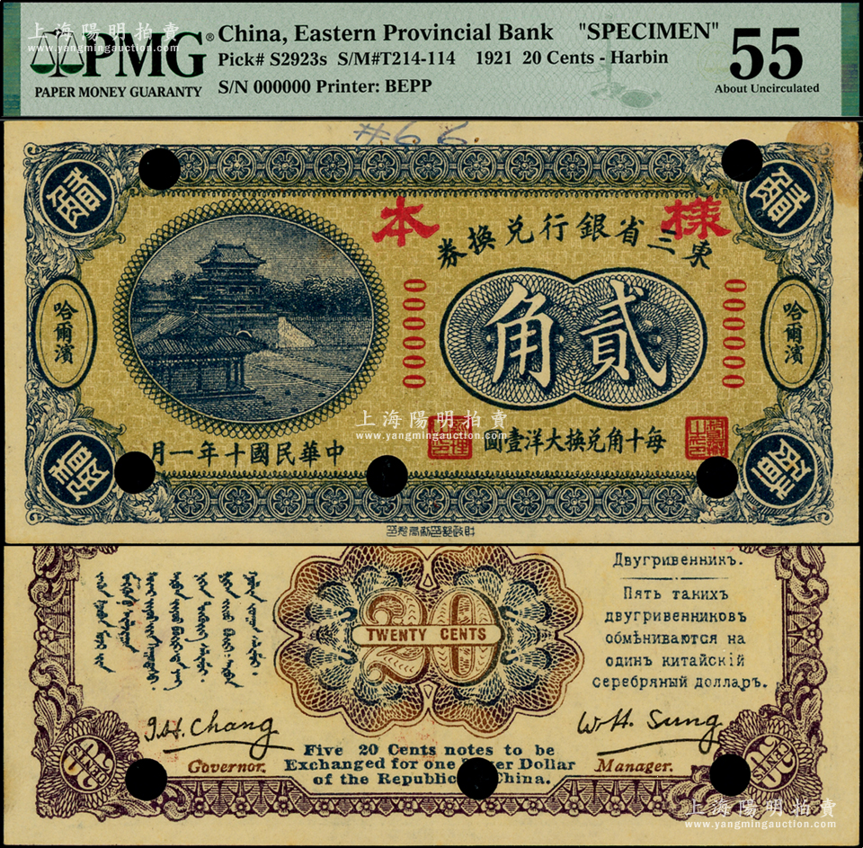 民国十年(1921年)东三省银行兑换券贰角样本,正背面合印,哈尔滨地名,属深蓝色第一版“征蒙”专用,故背印蒙文和俄文,且有英文签名,少见,未折九成新