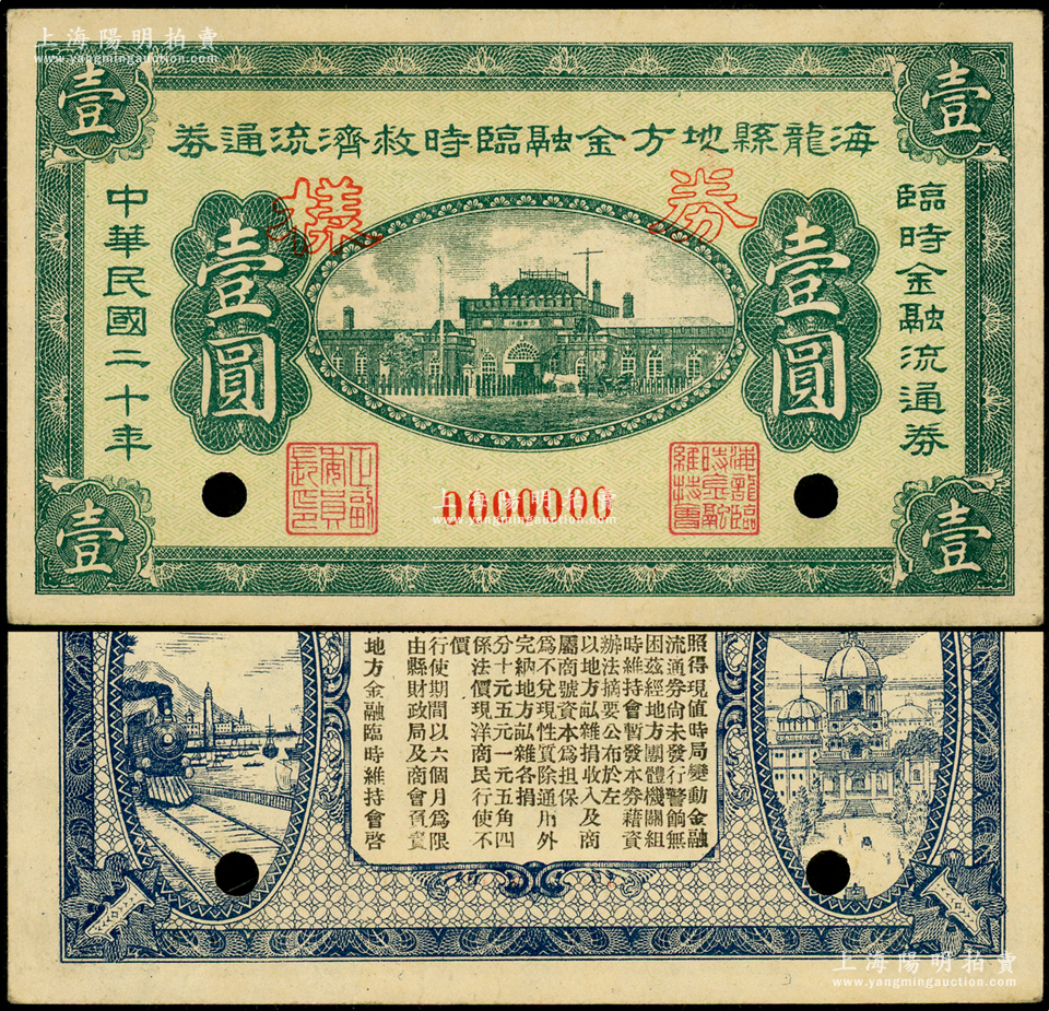民国二十年(1931年)海龙县地方金融临时救济流通券壹圆样券,背印火车、洋楼图和佈告,乃属东北义勇军时代纸币;海龙县时属奉天省,1954年划归吉林省(现改称梅河口市);海外回流品,罕见且属首度公诸于阳明,近九成新
